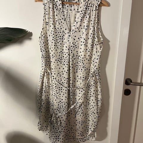 H&M Hverdagskjole i rosa farge, designet for kvinner. Kjolen har størrelse 44 og er laget av 100% viskose. Den har kort erme og en løs passform med snøring i midjen for justering. Passer til hverdagsbruk.