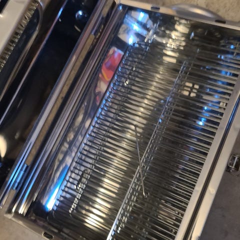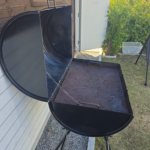 Grill med metallrist og perforert plate for matlaging. Egnet for utendørs bruk, laget av metallmateriale. Passer til grilling av ulike typer mat. Det er en stor tønne grill grillen er ikke brukt stått i garasjen.
