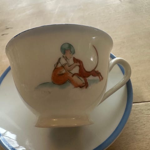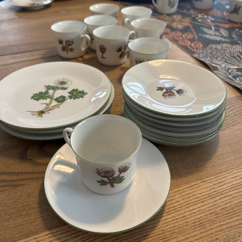 6 komplette med kopper, underskåler og tallerkner