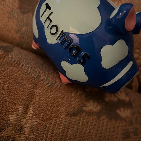 Liten fin Sparegris med plastpropp i bunnen. 10 cm lang, 7 cm bred, 7,5 cm høy.