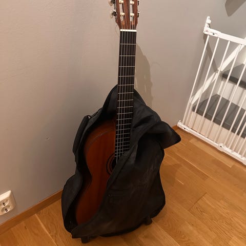 Eko akustisk gitar med klassisk design. Gitaren har en trefinish med synlige bruksmerker og slitasje. Den har seks strenger og en tradisjonell resonanskasse. Passer for akustisk spilling og øving.. mangler 2 strenger. Er vel lett å fikse.