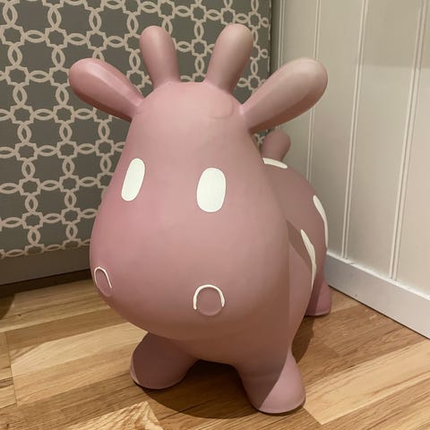 Helt ny hoppeku fra Yngri. Grå farge. Ligger uåpnet i eske, pumpe medfølger også i esken. Nypris på Barnas hus er 299 kr. Selges for 150. Hentes på Raufoss.
