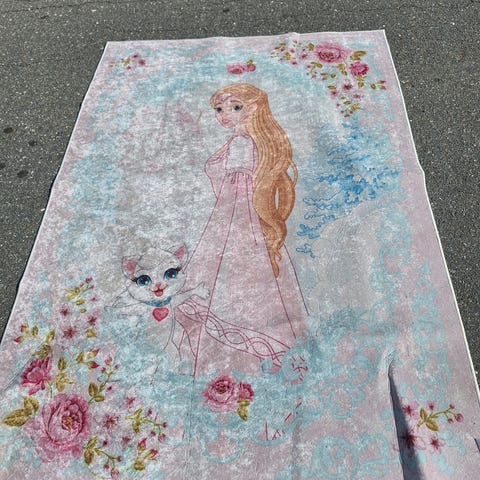 Fint teppe av Elsa og Anna i Frost. Har et merke på armen til Elsa (se bilde) og sprekker på baksiden (ikke synlig i daglig bruk). Ellers i god stand.