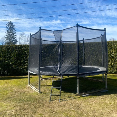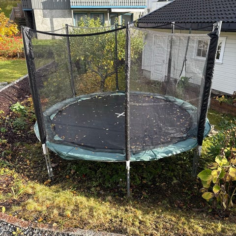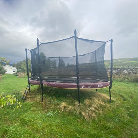 Jumpking oval trampoline. 3,1 x 4,6 m Godt brukt men i god stand. En av åpningene er ødelagt men stengt.
