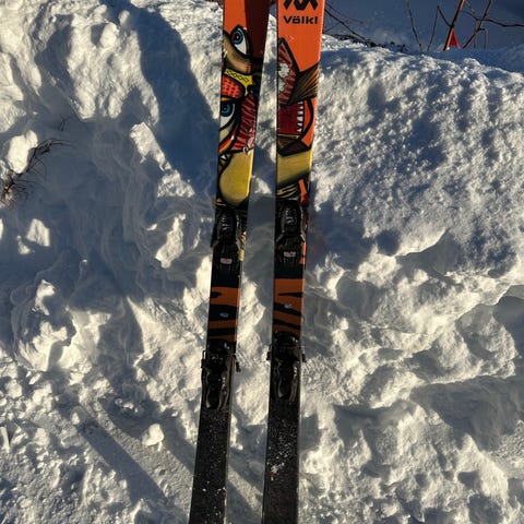 Völkl twintip/alpinski med lengde på 177 cm Skiene har ingen bruksmerker og slitasje, og er i god stand.