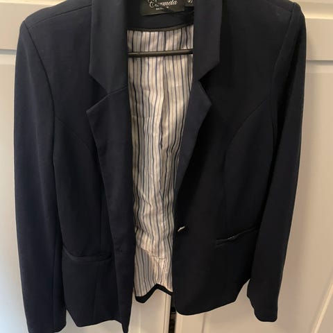 Blazeren er svart og har to knapper foran. Innvendig fôr er i lys grå farge med stripemønster.