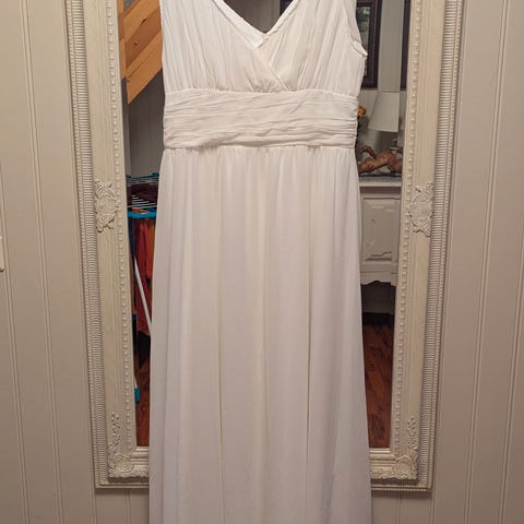 Den har nettopp blitt vasket. Det går an å sy den inn bak og på sidene. Lagt inn stretch bak på ryggen så den ikke skal være trang rundt busten. Fin i bryllup eller som brudekjole. Selges for 500kr.