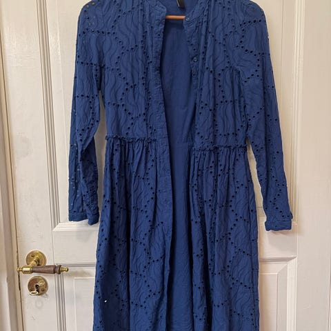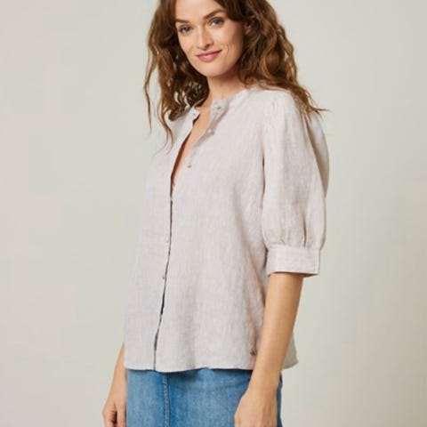 Sval og behagelig bluse i 100% lin med delikat mønster. Blusen har v-utringing, frontknepping, 3/4 lang erm med splitt og to knapper og bærestykke bak med fold i ryggen. Ledig passform og liten sølvfarget metallogo nede til venstre