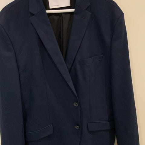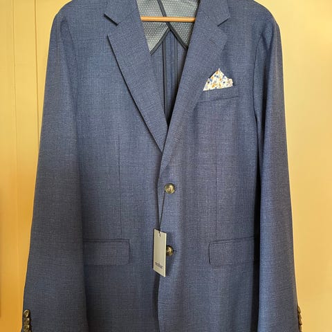 Matinique dressjakke i ull i størrelse 54 for menn. Jakken har et grått rutemønster og er laget med brune innerfôr. Den har knappelukking og lommer, egnet for formelle eller semi-formelle anledninger.