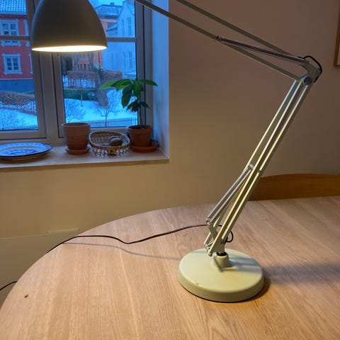 Noe kosmetisk bulker i skjerm og bør strammes litt i ledd. Ellers en stilig designklassiker. Bordklemme medfølger.
