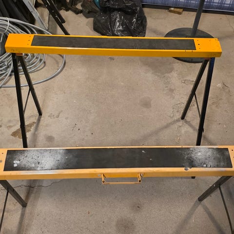Jeg selger mine 4 stk. nye, fine og umonterte arbeidsbukker, NEHA, stål i blå farge. Jeg har dessverre ikke fått brukt dem, og de har ligget i boden noen år, så på tide at andre får mulighet til å bruke disse fine arbeidsbukkene. Disse kan brukes i en rekke forskjellige kombinasjoner f.eks. å holde material/plater eller annet. Hver bukk er verifisert for å bære 150 kg. De kan høydejusteres i 6-7 trinn.