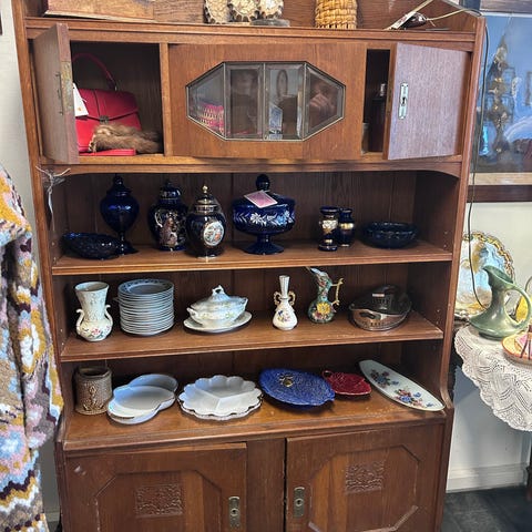 På toppen så skrår det nedover inn mot veggen. Høyde bak 177 cm, og foran 186 cm. Bredde 143 cm. Dybde 54,5 cm. Bruksspor forekommer. Kr 2000.- eller bud.