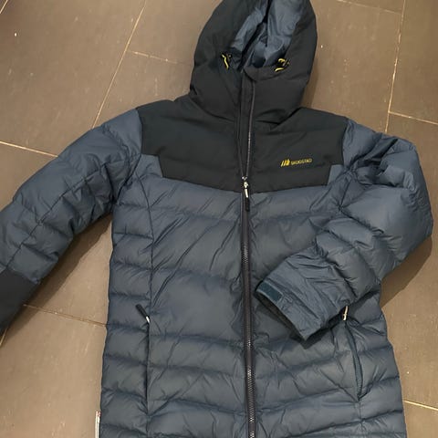 Jakken har ingen skader, men har flekker på ermet og ved venstre lomme som ikke går av i vask.