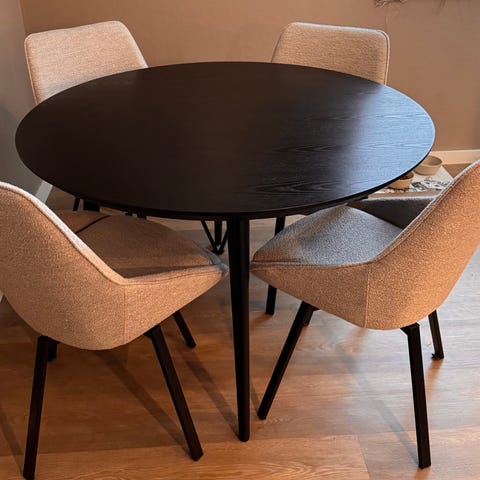 Ett svart Ikea-bord i fin tilstand. Vi har brukt voksduk over det på grunn av småbarn, og dermed er det knapt noen synlig slitasje på oversiden. Det går an å forlenge bordet, men det mangler en skive – vi har laget en provisorisk løsning (se bilde 3 og 4). Man kan sikkert finne reservedel på Ikea eller noe tilsvarende om man liker å fikse. Eller er du ute etter et stort rundt bord, er dette noe for deg. Vi har klart å sitte 6 stykker rundt det som mest.