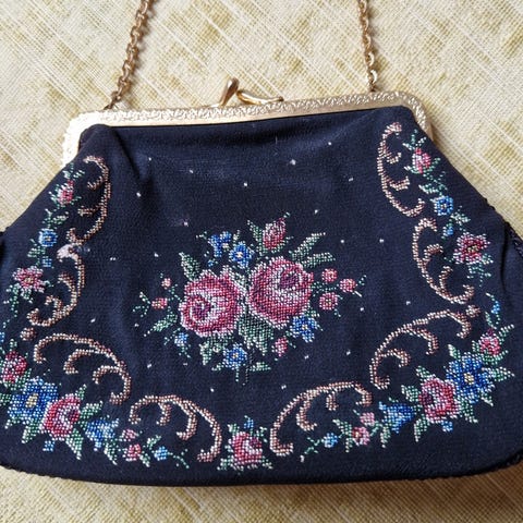 Selger en gammel, brodert veske. Godt brukt. Flekker og et lite hull - se bilder.