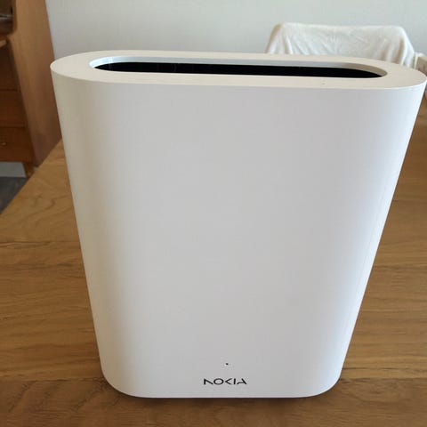Nokia 5G Gateway 2 Modem med hvit farge. Enhet designet for 5G-nettverk med flere tilkoblingsmuligheter. Passer for bruk i hjem eller kontor for trådløs internettforbindelse.