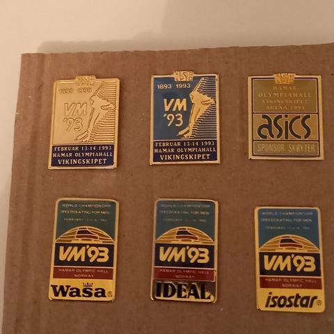 7 ski og skøyteautograf pins fra arena Lillehammer/ vikingskipet Hamar 1994