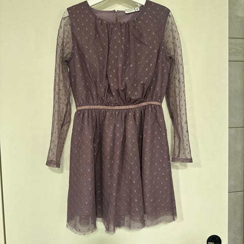 Name it Kjole i størrelse 128 for. Kjolen er svart med en mønstret overdel og en glatt, plissert skjørtedel. Perfekt til jul og nyttår. Veldig pent brukt. Kan vaskes på 40 grader.