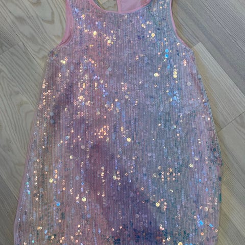 H&M kjole i rosa farge, paljetter, størrelse 122. Veldig pent brukt. Kan vaskes på 40 grader. Perfekt til jul og nyttår, men også bursdager og anledninger resten av året.