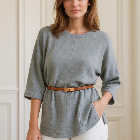 Dette er en nydelig, klassisk cardigan i et flott, nøytralt bomullsstoff. Tidløst design. Små detaljer som de skjulte knappene kombinert med det vakre, metallisk stoffet gjør denne genseren til en glede å ha på seg.