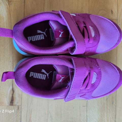 Puma Barina barnesko i størrelse 30 for jente. Skoene er rosa og laget av tekstil og syntetiske materialer. De har borrelås og elastiske lisser for enkel på- og avkledning. Brukt en gang i gymtime.