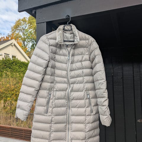 Veldig lite brukt dun kåpe. Den er for stor for meg (jeg er XS). Ingen bruksmerker. Den framstår som helt ny.