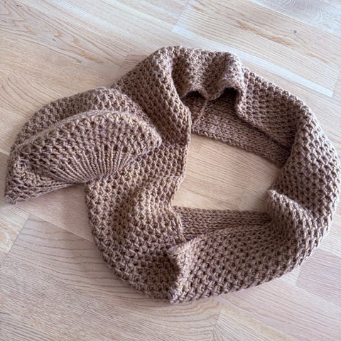 Selger et flott hjemmestrikket skjerf, lengde 180 cm, bredde 22 cm
