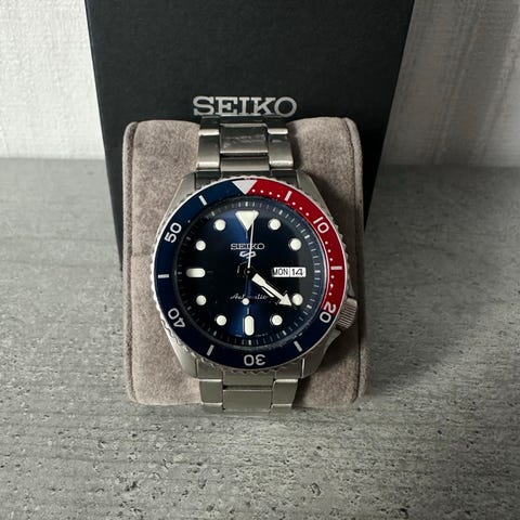 Selger en flott Seiko 5 Sports med modellnummer 7S36-04N0. Klokken er pent og lite brukt, og fremstår i meget god stand. Ingen riper i glasset, urverket går som det skal, men klokken har en liten sprekk i skiven rundt i mellom 3 og 0. Den er ikke merkbar ettersom jeg kun la merke til den da jeg studerte klokken for estimere en verdi.
