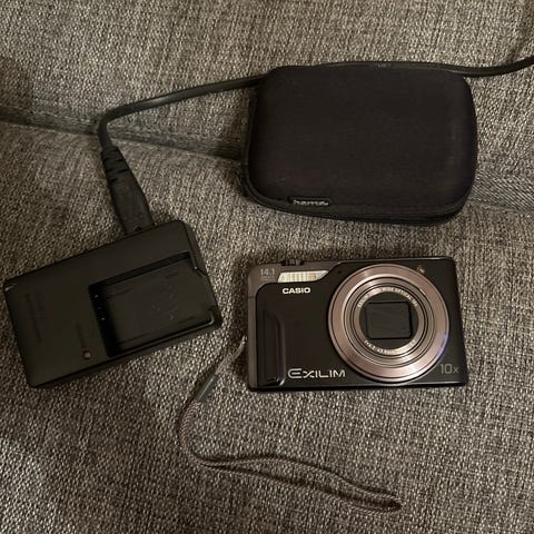 Casio Exilim digitalkamera med 8.1 megapiksler oppløsning. Kameraet har en sølvfarget kropp og er utstyrt med en skjerm på baksiden for visning av bilder. Egnet for generell fotografering og enkel bruk.