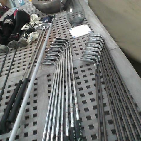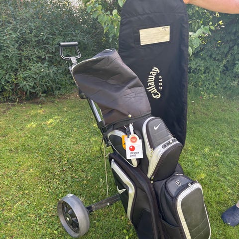 Golfkøller sett inkludert ulike køller som driver, jern og putter, samt en bærebag og vogn. Settet inneholder flere køller med ulik lengde og hodeform, egnet for golfspillere. Bagen har flere lommer for oppbevaring og bærestropper for enkel transport.