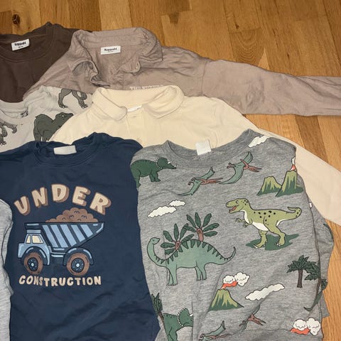 9 overdeler selges samlet. 4 collegegensere, noen fra George (som er små i størrelsen, derfor selges 122 genser i denne pakken), 3 tynnere gensere i tynn strikk, en tynn strikk jakke og en langermet t-skjorte. 225 kr samlet, 25 kr per del. Kan sendes, men for mye til liten pakke, så sjekk gjerne ut de andre annonsene, så kan jeg sende flere pakker samlet :)