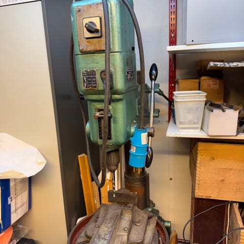Mema Typ 1626 boremaskin med elektrisk motor, Opprinnelig laget for 380V~ 3 fas spenning, 50 Hz frekvens og 2300 omdreininger per minutt. Jeg har kontrollert børster, smurt, skiftet kabel og plugg, og brukt den på 230v trefas. Hastigheten er 2300rpm (med 50Hz), men effekter er da litt lavere. To smørekamre er gjenget, så du smører spindelen ved å skru på hodet. Maskinen er fra 1967, derav tallet støpt i foten.