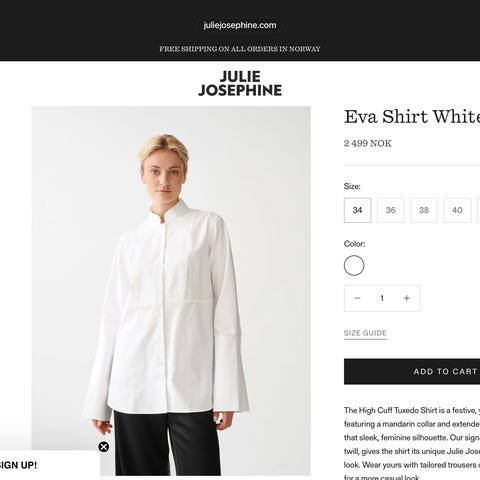 Julie Josephine skjorte i hvit farge, størrelse 38 for dame. Laget i materiale som gir en glatt og ren finish - bomull. Skjorten har lange ermer og knappelukking foran, med en enkel og klassisk design som passer til ulike anledninger. Nypris kr 2500