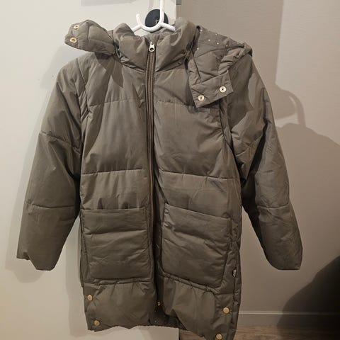 MINI A TURE vinterkåpe i størrelse 164. Fargen er brun med hint av grønt (muldvarp?), den er foret med Primaloft isolasjon for varme. Den har hette, glidelås og trykknapper, samt flere lommer for oppbevaring. Passer til bruk i kaldt vær. Fin til både hverdag og litt mer pyntet! Manger dessverre beltet.