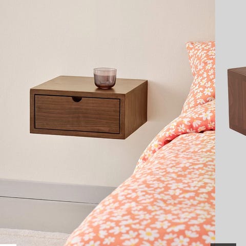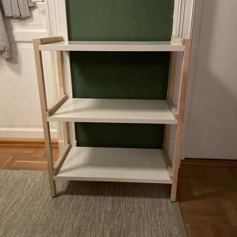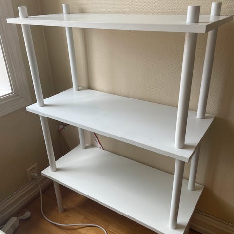 Stilig lite nattbord/sidebord i en sjelden, geometrisk form. Laget i laminert plateverk med små hjul under, noe som gjør det lett å flytte rundt. Har en åpen hylle, en liten skuff og god plass nederst – praktisk både som nattbord, plantebord eller oppbevaring i entré/kontor.