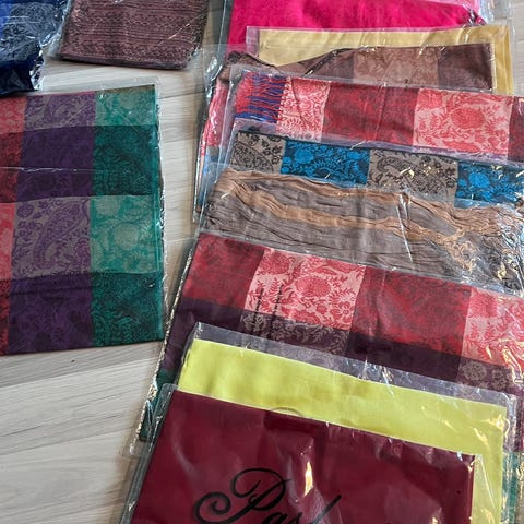 Sjal brukt 1 gang. Str.200 cm x 62 cm. Perlebesatt i den ene enden. Kjøpt i Dubai. Pent til julebordssesongen.