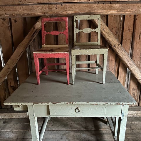 Bord og stoler står i 2 etasje med en litt vond trapp, så det trenges folk til og få det ned.
