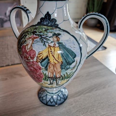 Flott, vintage keramisk blomster vase dekorert med stiliserte menneskefigurer i grå mot brun bakgrunn. Vase har geometriske mønstre øverst og nederst. Noen små nag på bunn, men synes ikke mye. Noe bruksmerker vil du finne. Merket under. Blomstervase er produsert på Kråkerøy keramikk en gang mellom 1945-1965.