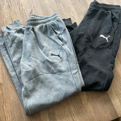 To joggebukser fra Nike i str. M (blå og grå), en shorts fra Nike i str. S (grå), og en shorts fra Puma i str. M (burgunder). Alle plagg er i collegestoff.