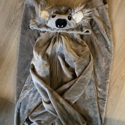 Kosefrajt i blå farge, størrelse one size, unisex. Fleece. Veldig behagelig. Vet ikke merke. . Laget i mykt materiale med hette og knapper foran. Designet som en dyredrakt med detaljer som øyne og nesebor på hetten, samt hvite og blå detaljer på kroppen. Passer til barn og kan brukes som kosetøy eller kostyme.