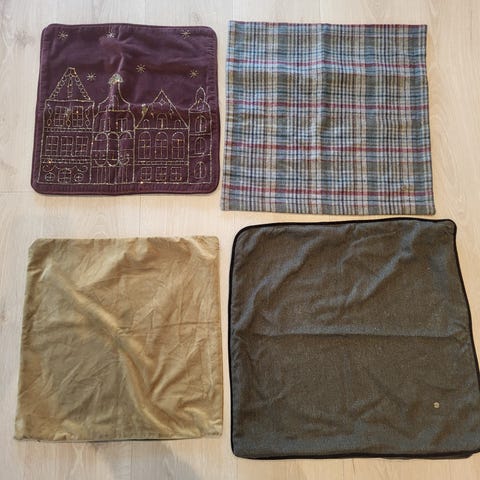 Pent brukte putetrekk. Kjøpt på Home&Cottage eller Kremmerhuset. Svart, hvit og grå er velour.