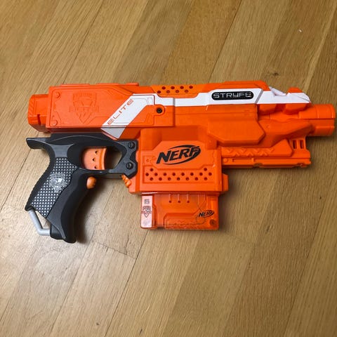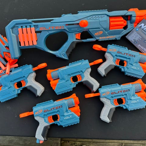 Nerf diverse modeller. Har satt sammen to pakker med diverse Nerf. Hver pakke inneholder også en modell av et annet merke. Det følger med en pose med ammunisjon til hver pakke. Alt fungerer som det skal. Pakke 1 inneholder også Laser X https://www.partyking.no/laser-x-double-pack-60225.html