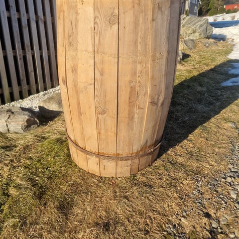 Passer til utendørs bruk i hager eller på balkonger. Laget av restmaterial som er skåret til for hånd. Består av ca. 40 deler som er limt limt og stiftet