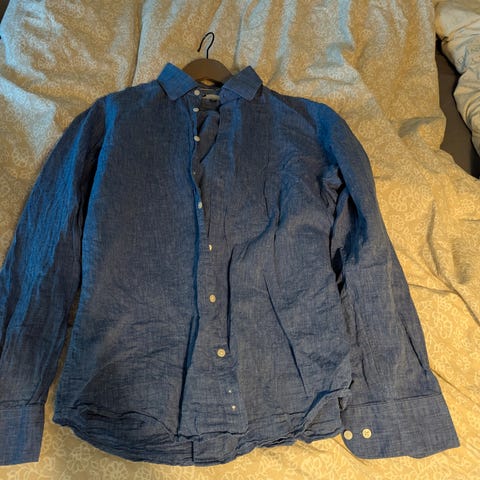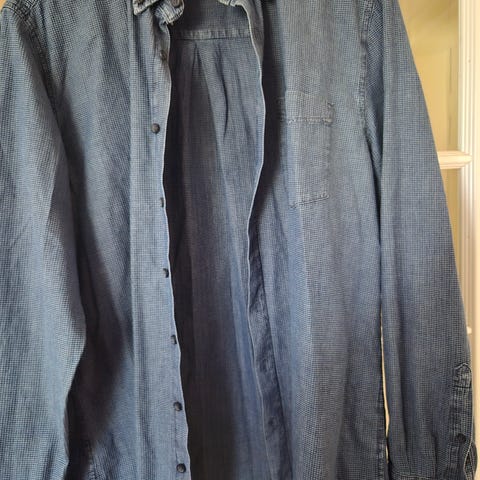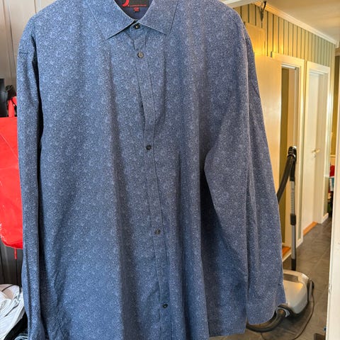 Skjorten er i blått og hvitt, med blått som hovedfarge. Er langermet og lun. Har en brystlomme.