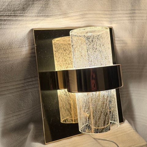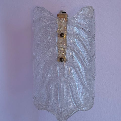 #A wall lamp rom 1970s Nautical -Høvik Verk -Hadeland Glassverk Navy sconces composed of brass brackets set with cylindrical hand-blown tubes of rain-effect glass.## Høvik Verk designed by Jonas Hidle #Lampa er i polert flott messsing med munnblåst bobleglass(luseglass)fra hadeland Glassverk.Veggålate 29x23,5 cm Ut fra vegg ca 22 cm. Lang ledning med av/på bryter jordet støpsel