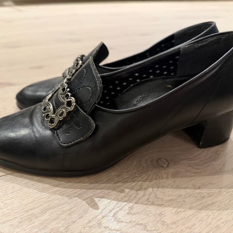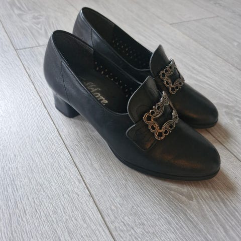 Pent brukte Folklore Bunadssko (norsk design) selges. Skoene har en 5 cm høy hæl målt fra baksiden av skoen.