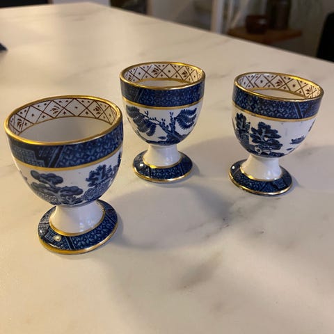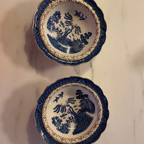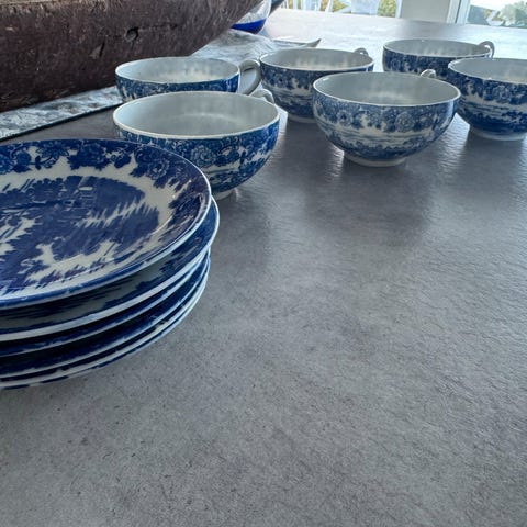 En ene asjetten har et skår på undersiden. Vises ikke fra oversiden . Diameter 17 cm