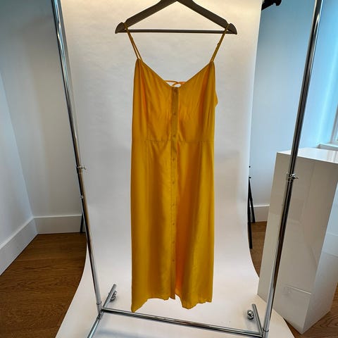 Mye volum. Pen gulfarge. Perfekt sommerkjole til sommerbrun hud. Glatt, deilig stoff.