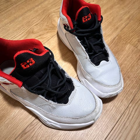Nike Air Jordan 5 high top sneakers in white and red. Made of leather and textile materials. size 45. The shoes have lacing and branded details such as '23' on the side and 'Nike Air' on the heel. Suitable for casual wear and collection.