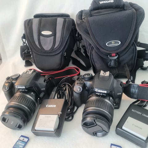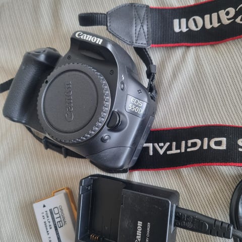 Selger et Canon EOS 500D (også kjent som Rebel T1i) speilreflekskamera med standard kit-objektiv og nødvendig tilbehør. Dette er et flott kamera for nybegynnere eller de som ønsker et pålitelig og solid kamera for foto og Full HD-video (1080p).
